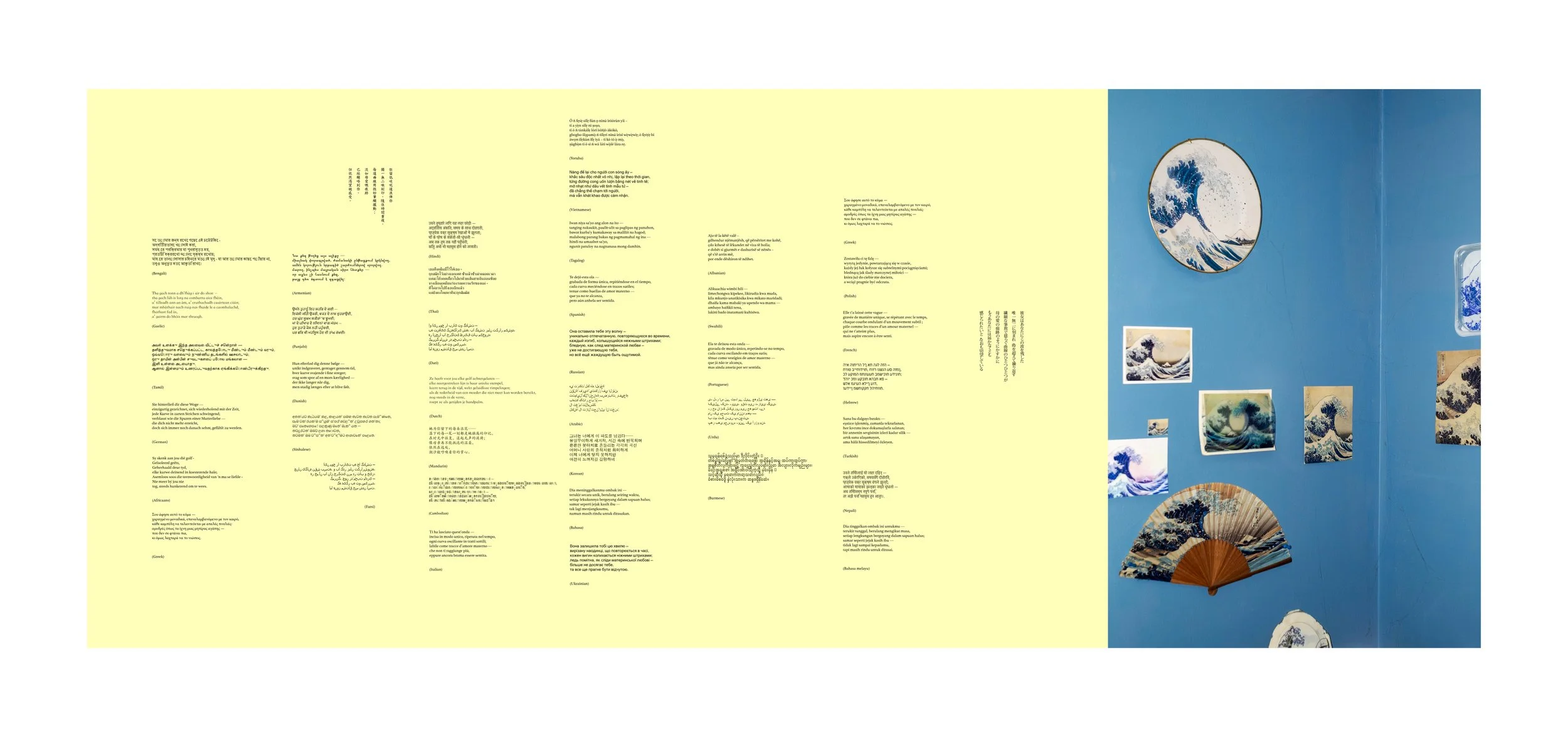 Mother’s Waves is a digital wall installation inside The Museum of Lost Heirs (VOID_Melbourne, March 2026). This wall paper echoes the unclaimed inheritance of language and tradition within diasporic communities, using artist Sarah Goffman’s practice of relentless reproduction Hokusai’s iconic The Great Wave off Kanagawa to conjure a sense of lost mother’s touch. Utilizing AI trained on this conceptual framework, the wall paper engages the intimate act of reading in an immigrant’s mother tongue, it invites a personal reckoning with loss and heritage, fostering moments of quiet wonder and discovery amidst the fractures of displacement experience by immigrants who have come to see Australia as motherland.