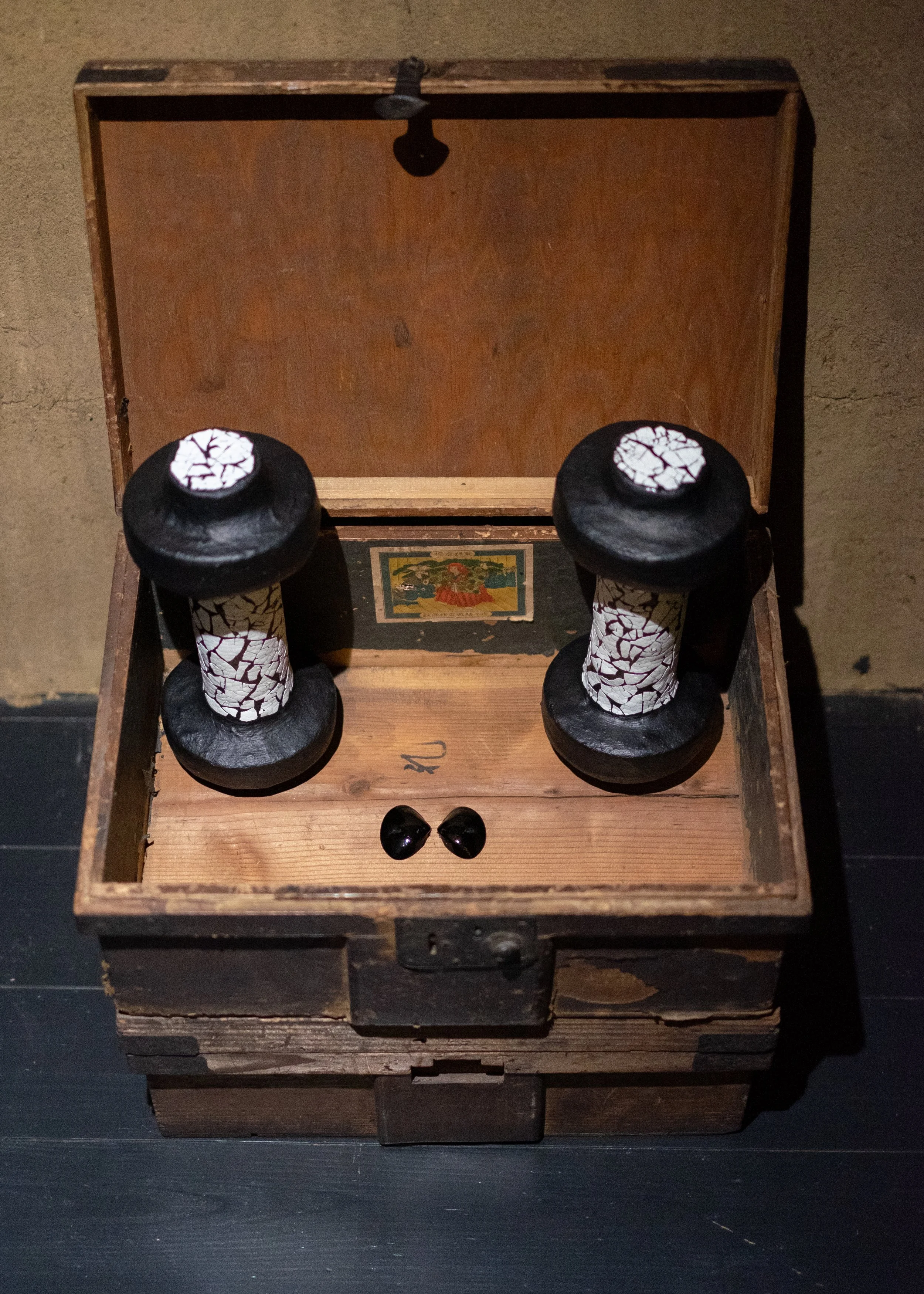 Wei Weng, Prototype In Becoming A Better Ringleader, lacquerware, wires, chain, assemblage dimension 275cm x 18cm x 8cm, 2023